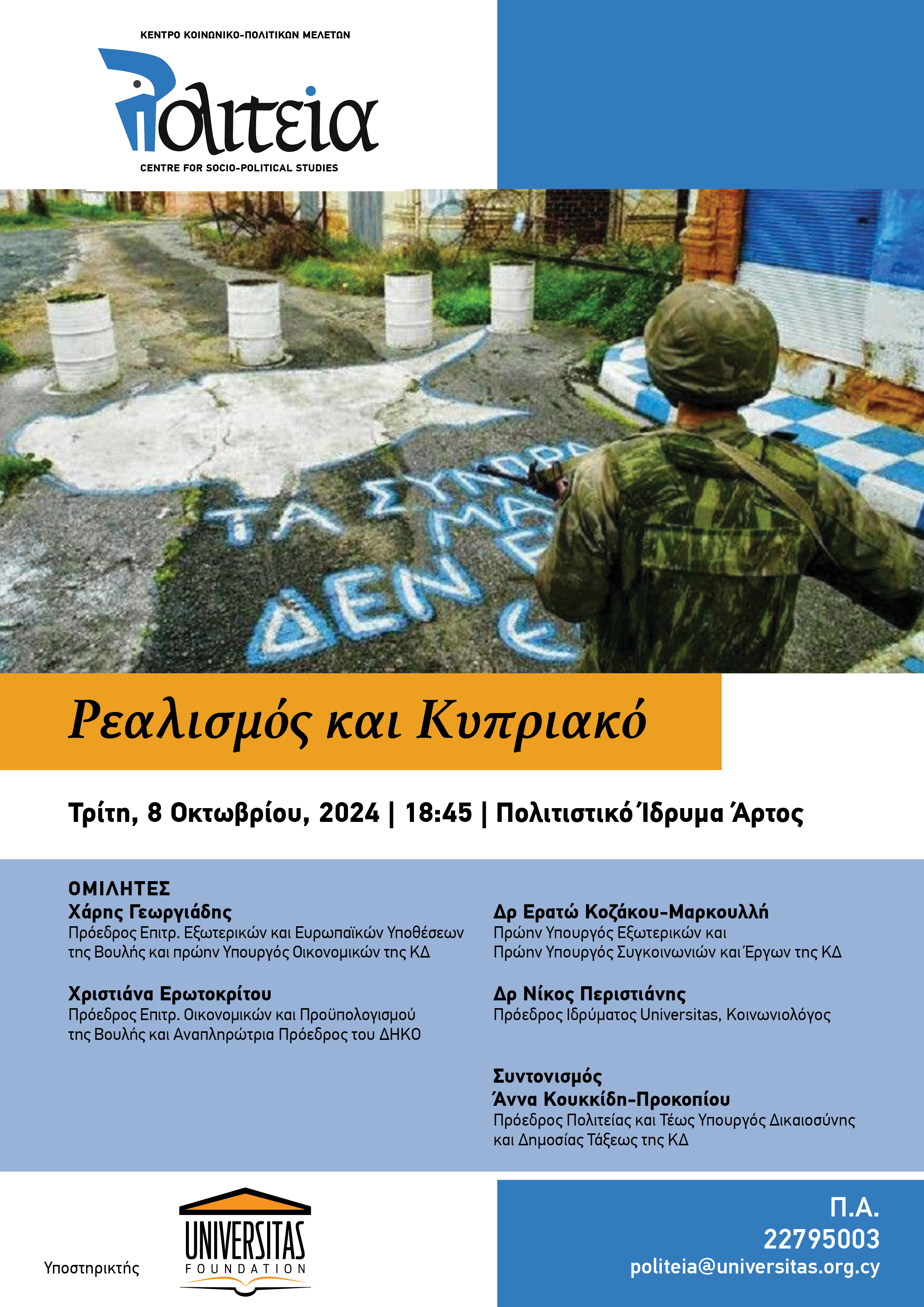 Το Κέντρο Πολιτεία και το Ίδρυμα Universitas διοργανώνουν συζήτηση με θέμα «Ρεαλισμός και Κυπριακό» . Ομιλητές από τον πολιτικό και διπλωματικό χώρο αναλύουν τις σύγχρονες προσεγγίσεις στο Κυπριακό.