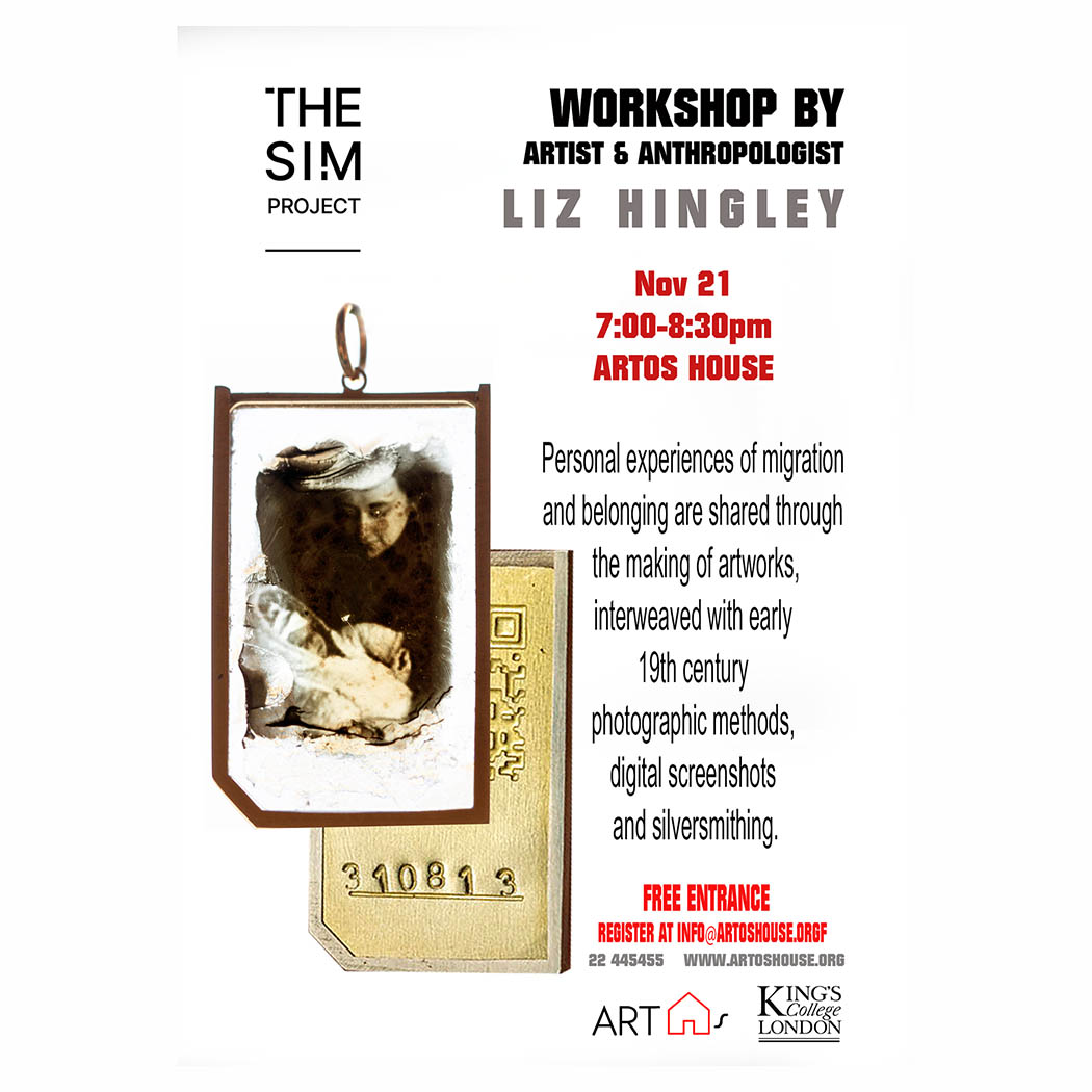 The SIM Project workshop explores migration and belonging through craft, early photography, digital screenshots and wearable SIM-art. Artist–anthropologist Liz Hingley guides activities mapping how SIM cards shape identity and connection, inviting participants to share a “screenshot with a story.”